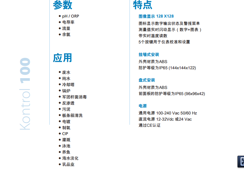Kontrol 100系列單參數(shù)儀表 是一款設(shè)計用于滿足礦泉水加工、純水、CIP、食品生產(chǎn)及加工、鍋爐水處理等諸多水處理領(lǐng)域之水質(zhì)檢測控制儀表。